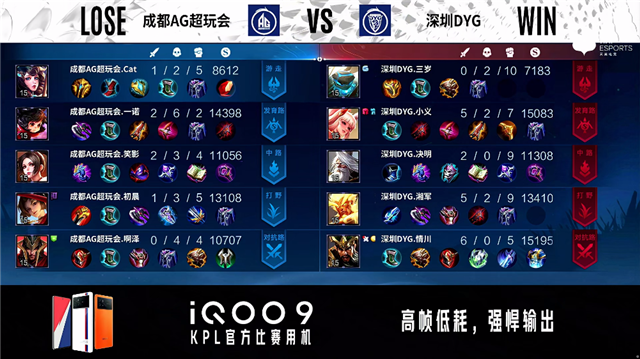 2分14秒,深圳DYG控下暴君。2分27秒,下路团,深圳DYG打出1换2。3分40秒,深圳DYG中路打出0换2。4分15秒,双方团战1换1。5分14秒,深圳DYG控下先知主宰。6分10秒,深圳DYG关羽下路单杀李元芳。8分08秒,野区团,成都AG超玩会击杀盾山。8分32秒,深圳DYG上路击杀蒙恬。9分11秒,深圳DYG击杀大乔。9分40秒,深圳DYG控下先知主宰,随后破掉成都AG超玩会上一塔。9分50秒,深圳DYG关羽下路再次单杀李元芳,随后队伍破掉成都AG超玩会中一塔并击杀蒙恬。11分17秒,深圳DYG控下暗影主宰。11分42秒,深圳DYG破掉成都AG超玩会中二塔。12分28秒,成都AG超玩会击杀盘古。12分56秒,成都AG超玩会控下暗影暴君。14分38秒,深圳DYG破掉成都AG超玩会下二塔。15分07秒,深圳DYG控下暗影主宰并击杀李元芳。15分50秒,深圳DYG破掉成都AG超玩会上二塔。16分16秒,成都AG超玩会中路击杀盾山。16分49秒,成都AG超玩会控下暗影暴君,随后破掉深圳DYG中一塔。17分50秒,深圳DYG击杀云缨。18分56秒,深圳DYG控下暗影主宰。20分25秒,双方团,深圳DYG打出0换4。20分51秒,深圳DYG破掉成都AG超玩会中高地。21分02秒,深圳DYG击杀不知火舞后破掉成都AG超玩会水晶赢下比赛。