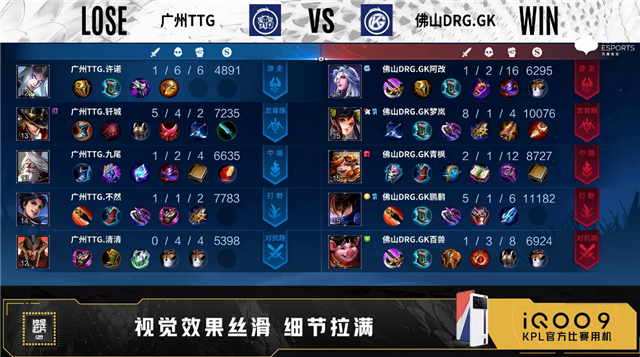 佛山DRG.GK五人抢中,44秒佛山DRG.GK反掉蓝BUFF,广州TTG阿古朵反掉红BUFF。53秒广州TTG暴君处击杀公孙离拿到一血。2分33秒野区团战双方游走位互换。3分27秒广州TTG发育路击杀公孙离。3分42秒对抗路双方1换1。3分45秒佛山DRG.GK发育路击杀孙尚香。5分 15秒广州TTG摧毁敌方对抗路外塔。5分24秒佛山DRG.GK野区击杀阿古朵。5分52秒佛山DRG.GK拿下暴君。8分49秒广州TTG拿下主宰。11分21秒广州TTG中路击杀公孙离。11分43秒广州TTG摧毁敌方中路外塔并击杀盾山。12分10秒广州TTG拿下暗影主宰。12分49秒广州TTG摧毁敌方对抗路二塔。16分10秒佛山DRG.GK拿下暗影主宰并击杀张飞。18分20秒佛山DRG.GK野区击杀孙尚香。19分08秒对抗路团战双方2换2。20分36秒龙王处团战佛山DRG.GK打出0换3。21分04秒佛山DRG.GK摧毁敌方中路外、二塔。21分52秒佛山DRG.GK强点水晶拿下比赛。