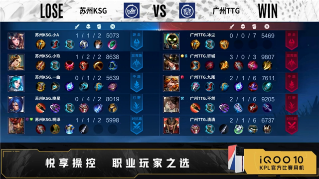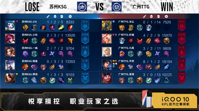 开局双方正常抢线。1分49秒河道苏州KSG击杀张飞,拿下一血,广州TTG拿下主宰。2分26秒发育路广州TTG击杀狄仁杰,打出1换1。3分46秒河道广州TTG击杀牛魔,打出0换1,拿下暴君。5分03秒中路广州TTG击杀沈梦溪,摧毁敌方发育路外塔。6分10秒野区苏州KSG击杀裴擒虎,广州TTG摧毁敌方对抗路外塔。7分15秒苏州KSG摧毁敌方对抗路外塔,中路广州TTG击杀夏洛特,打出0换1,拿下主宰。9分34秒广州TTG拿下暴君。9分53秒野区广州TTG击杀夏洛特,拿下暗影主宰。10分32秒广州TTG击杀狄仁杰,不知火舞二连击破,打出0换2,摧毁敌方发育路二塔、中路外塔、发育路二塔、中路二塔。11分37秒广州TTG拿下暗影暴君,13分06秒广州TTG摧毁敌方对抗路高地。13分47秒野区广州TTG击杀牛魔,摧毁敌方中路高地,打出1换3,摧毁水晶拿下比赛。